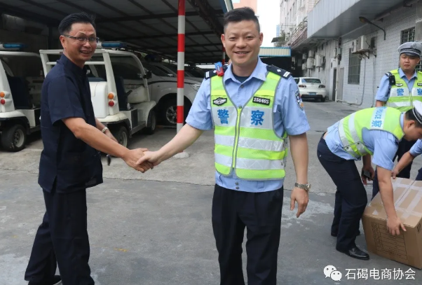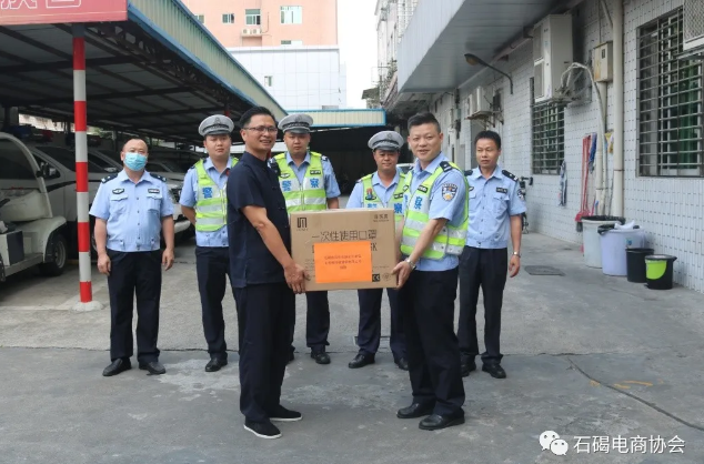 5月7日下午,石碣電商協會副會長單位東莞雅日玻璃鋼有限公司代表洪森向東莞市交通警察支隊南城大隊廣場中隊捐贈一次性防護口罩2000個,以實際行動為防控在前線的交警隊員們提供健康安全的保障。